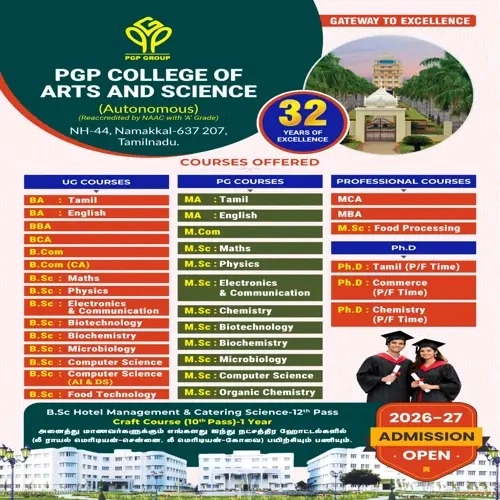 PGP College was established in the year 1994. It is located in the Namakkal, Karur NH-7. The PGP College of Arts and Science was established by our beloved Chairman Dr. Palani G.Periyasamy M.A.,M.A.,Ph.D (USA). The state of the art facilities in the college encourage the students to develop their various skills. The college runs in an eco-friendly environment and produces healthy education to the students. Our College offers 18 courses at the U.G. level and 17 at the P.G level. Research work has also been growing steadily alongside these courses. We start offering M.Phil and Ph.D (part time and full time) courses from the year 2007. The PGP CAS takes care to give in the young individual an integrated personality.